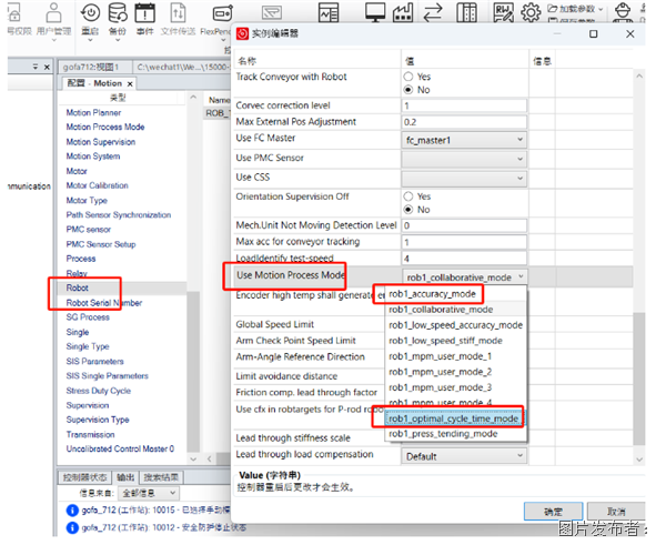 3. 对于个别高速应用,可以在配置-motion-Robot,选择Motion Process Mode为rob1_optimal_cycle_time_mode,默认rob1_collaborative_mode速度较慢。