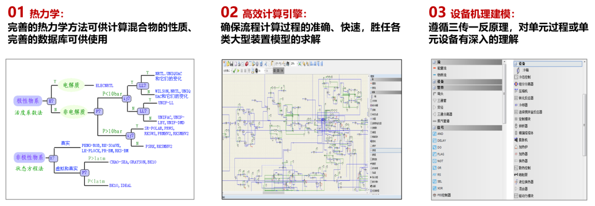 在流程模拟仿真领域,核心技术涵盖热力学、高效计算引擎和设备机理建模,如图3所示。其中,设备机理建模对于深入理解研究对象至关重要。在仿真过程中,仅依赖数据会带来不少问题,因此深入把握所描述对象的性质至关重要,这有助于解决诸多关键性问题,符合仿真的实际目标。中间的计算引擎也是以前国产软件中遇到的一个挑战,因为需要高效处理许多高度非线性的对象。如何有效地使用求解器来处理这些非线性对象是一个重大难题。除了热力学之外,这牵涉到很多流程模拟中的核心问题。