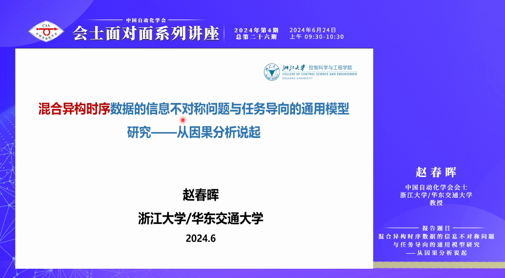2024年第4期,总第二十六期“会士面对面”讲座于6月24日成功召开,中国自动化学会会士、浙江大学/华东交通大学赵春晖教授作题为“混合异构时序数据的信息不对称问题与任务导向的通用模型研究——从因果分析说起”的报告。