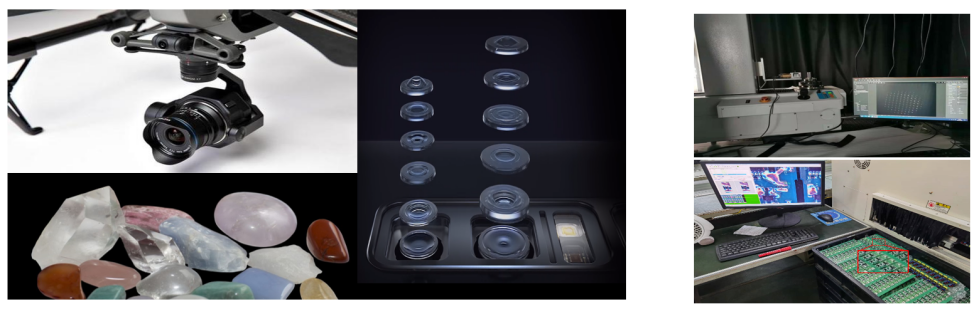 在精密光学领域,广州晶华利用本项目研发技术对高端天文望远镜透镜组提供可靠检测依据,天文望远镜出口量占全国38%,产品远销国内外近100个国家。在其他民用领域也得到广泛应用,如广电运通、深圳科比特、佛山华环珠宝等将本项目研发技术成功应用于高端金融机具、无人机智能巡检、宝石检验,如图8所示。