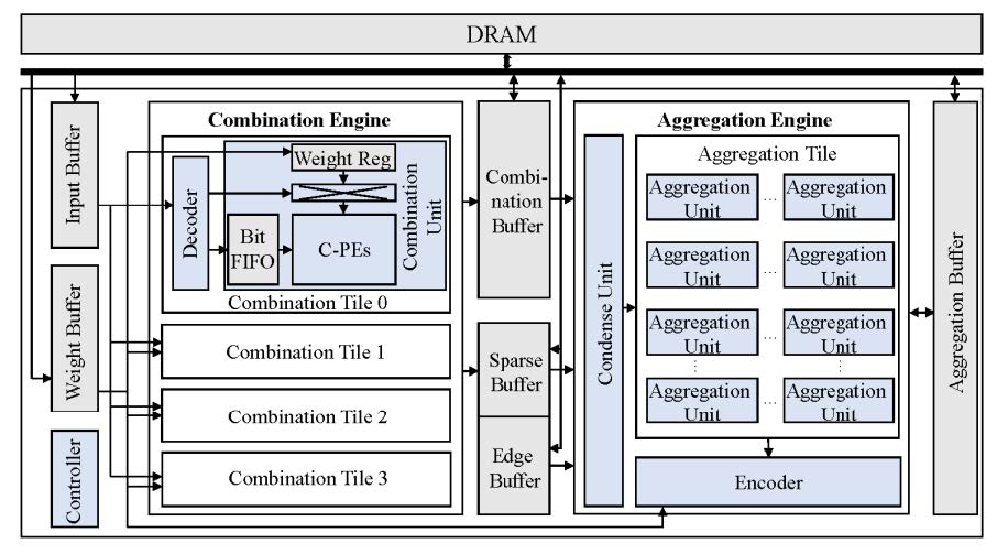 为此,在专用推理架构方面,团队针对压缩算法特性和图数据特性设计了一款专用加速器MEGA。通过比特位自适应的存储方式和高效的在线编解码压缩方法,最大限度减少了存储碎片化,降低了数据传输开销。此外,MEGA采用的Condense-Edge调度执行方式,能够将稀疏的边连接聚合在一起以增强访问节点特征时的空间局部性,提升数据复用度。在与英伟达 RTX3090 GPU相当的峰值算力设定下,MEGA实现了121倍的推理加速及476倍的能效提升。